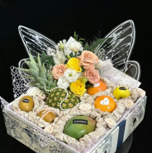【花果礼盒】黄粉玫瑰+混搭 水果方形礼盒随机搭配鲜果爱 意随风起(工艺繁琐,需提前预 定